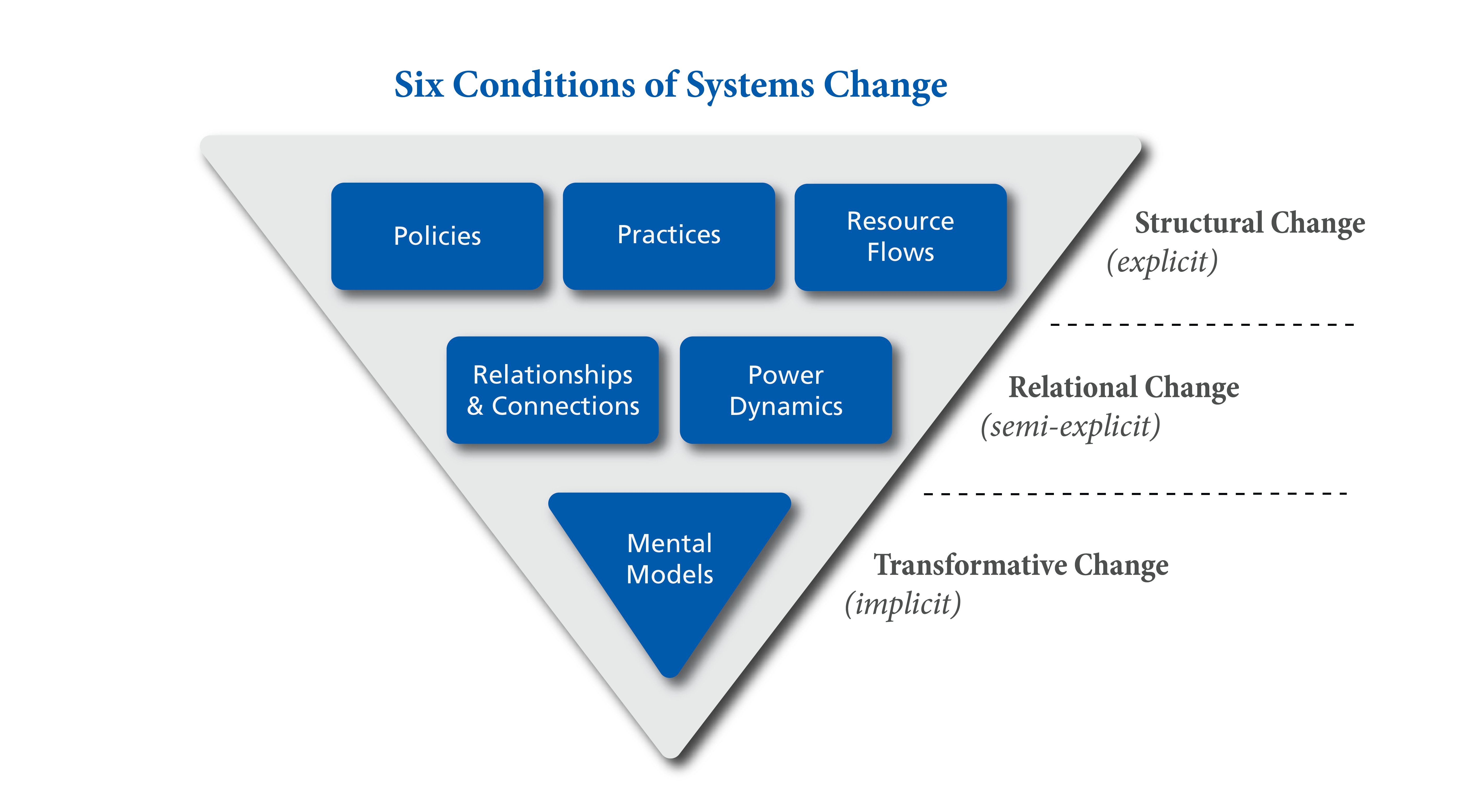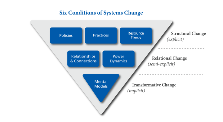 I recently tweeted about a 2018 FSG report called “The Water of Systems Change” that offers a valuable perspective of systems change work. The report was intended for private foundations to help them “shift the conditions that are holding a problem in place” (emphasis mine). FSG has also put together an Action Learning Exercise to accompany the report that will walk you through a series of reflective questions and activities.